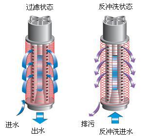 (2)原水進(jìn)入過(guò)濾器并由外向內(nèi)穿過(guò)過(guò)濾元件;懸浮雜質(zhì)被攔截在盤(pán)片外部和盤(pán)片之間。